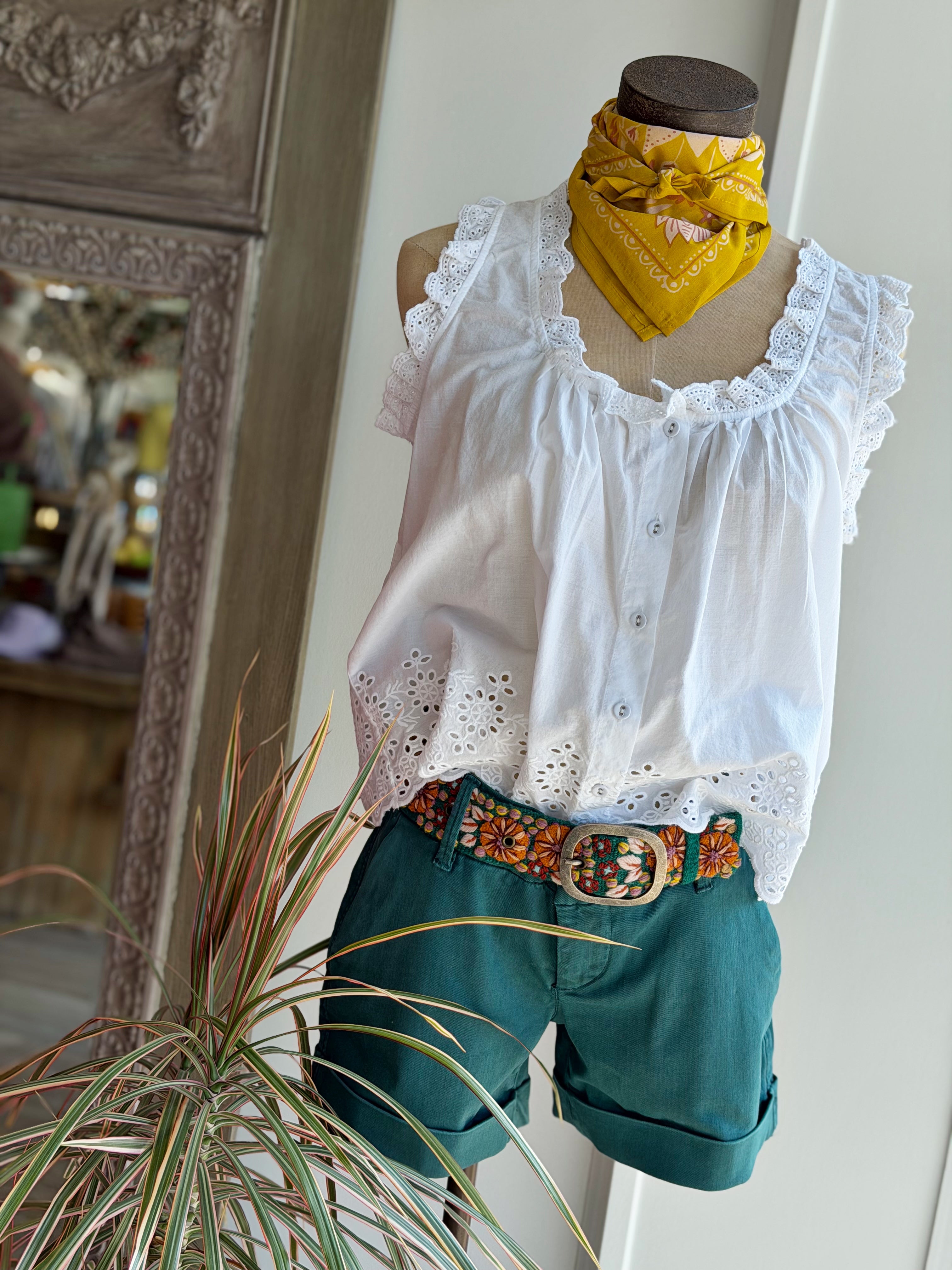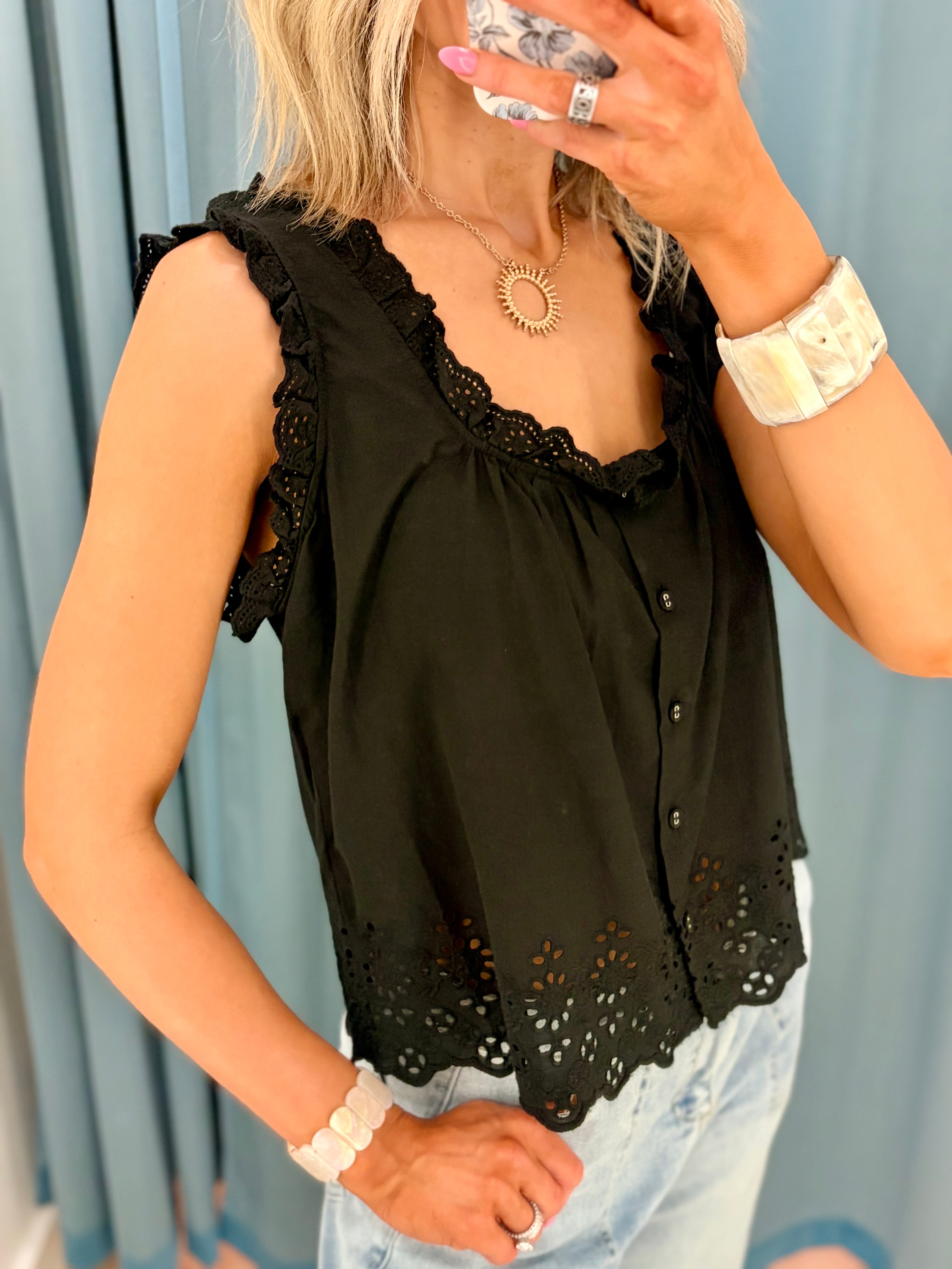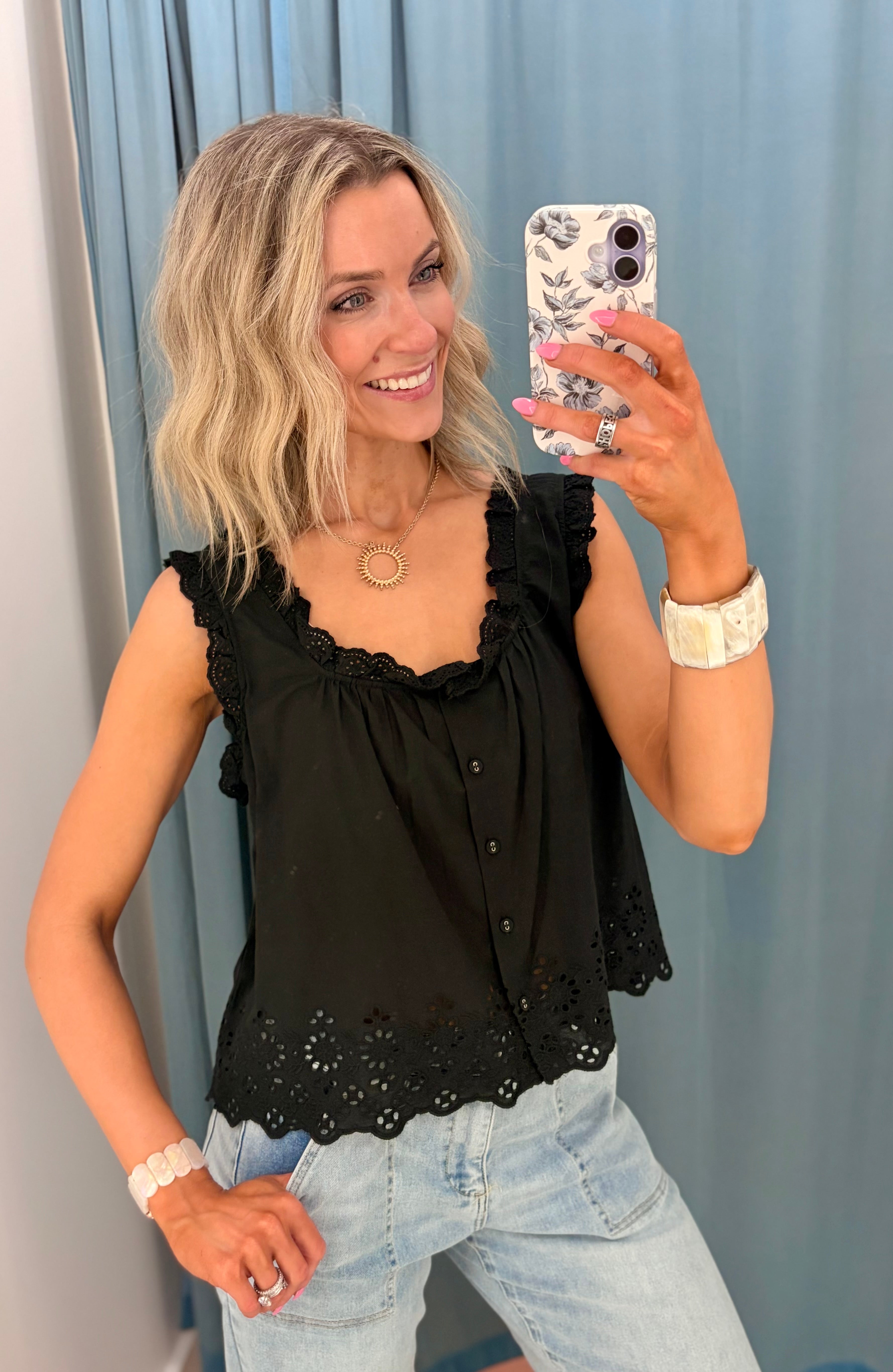 Light, airy, and effortlessly pretty. This cotton top features delicate eyelet detailing and soft lace trim for that easy, feminine look. The relaxed fit and button front make it perfect for warm days—just add denim, shorts, or a pop of color like this.