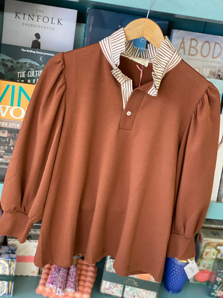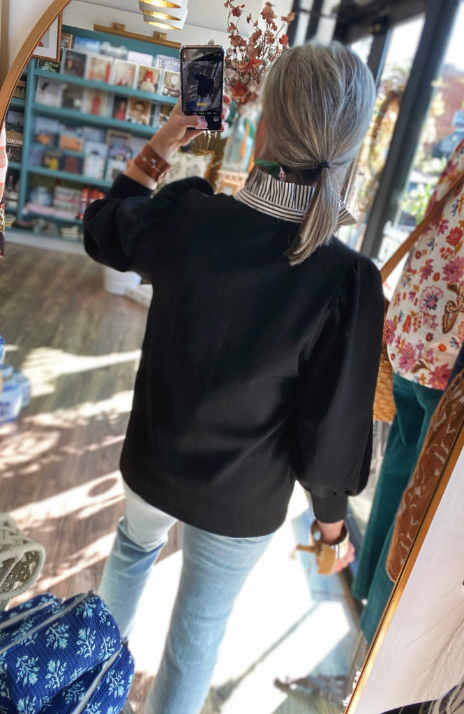 Effortless polish meets everyday comfort in this chic pullover top. Featuring a crisp black body with a contrasting striped collar and placket, this style gives you that “layered look” without the bulk. The subtle puff sleeves and slight stretch create an easy, flattering fit perfect for work or weekend wear.