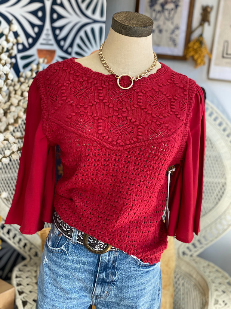 Romantic and timeless, this textured top is the perfect blend of comfort and elegance. Crafted from a soft cotton-rayon blend (97% cotton, 3% rayon), it features a beautiful crochet-style knit front and embroidered detailing for a touch of vintage charm. The flowy, wide sleeves add a feminine silhouette, while the ribbed hem provides subtle structure for a flattering fit.