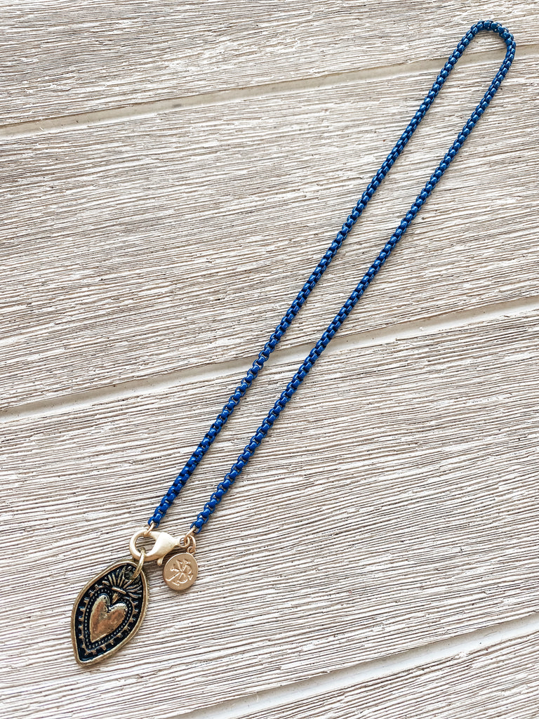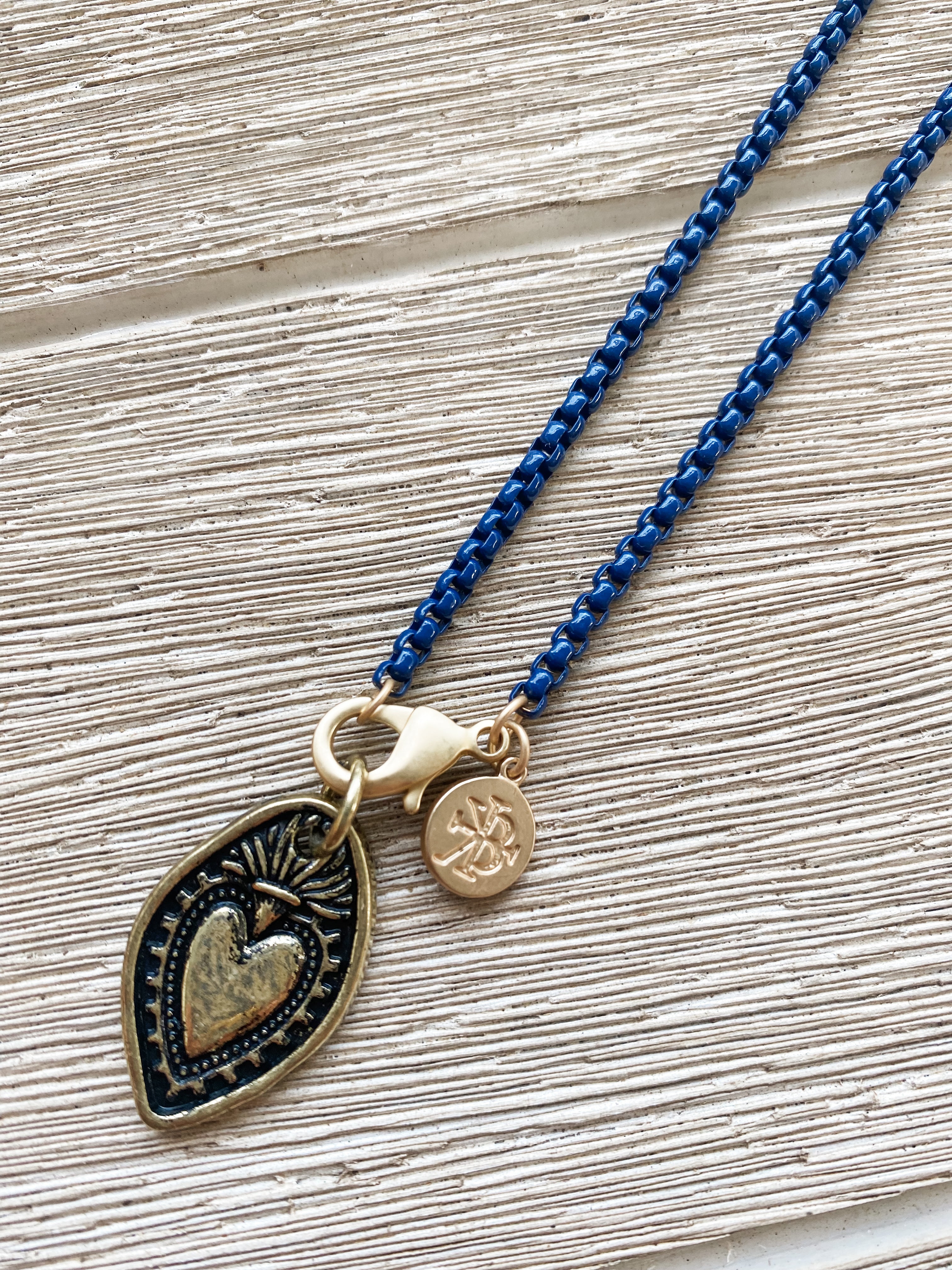 Brass Heart Charm set upon a Navy Enamel Chain with a Matte Gold Lobster Clasp. 18” chain.