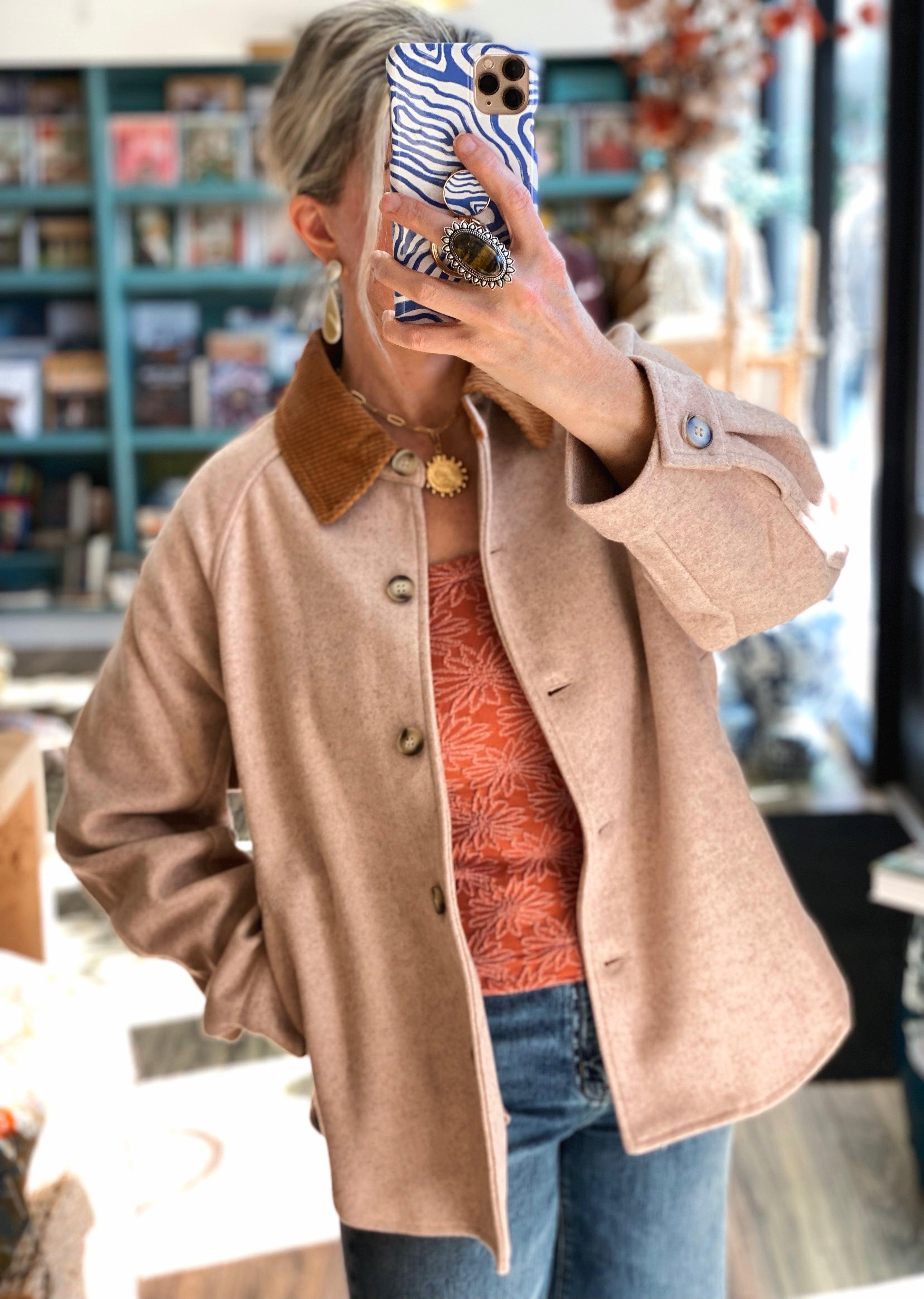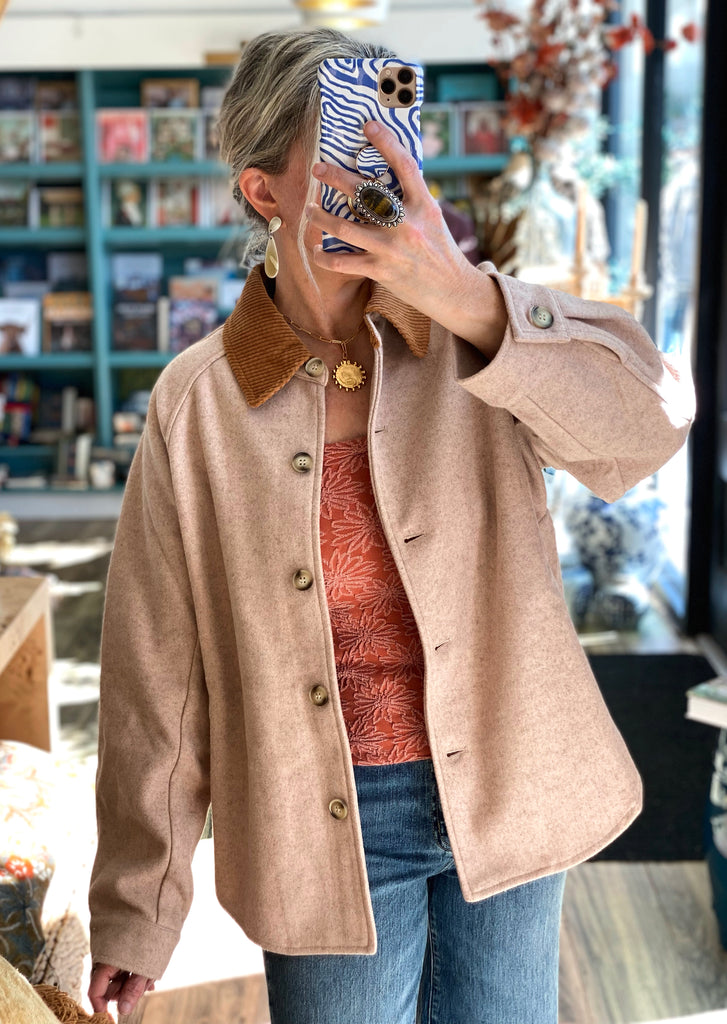 The contrast corduroy collar adds a touch of vintage charm, while the button-front closure and tailored sleeve tabs lend a structured finish. A neutral camel hue makes it endlessly versatile — perfect for transitioning between seasons in style.
