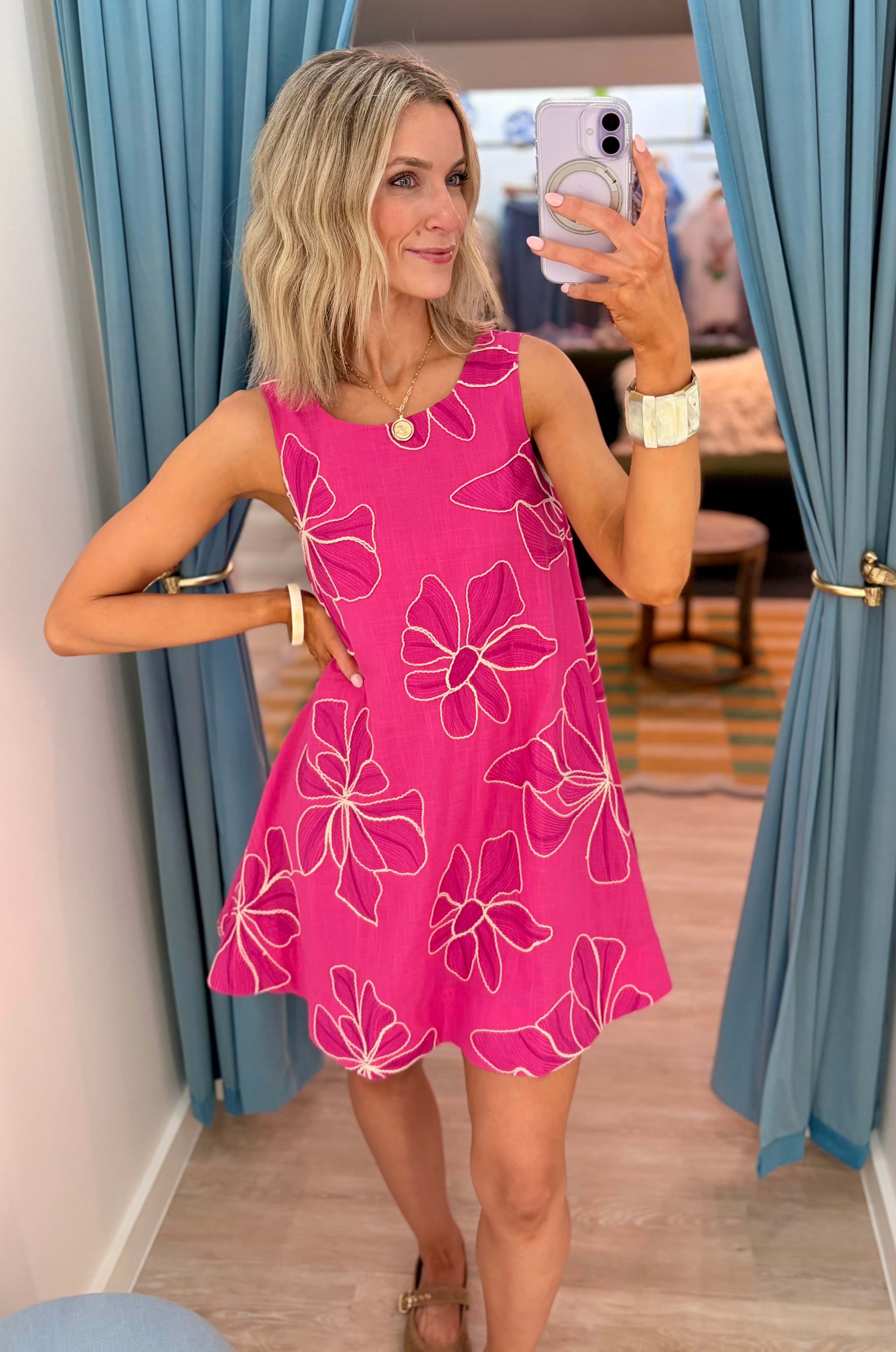 Add a pop of color to your wardrobe with our radiant magenta Clove Dress. This sleeveless design features a simple round neck and a flattering trapeze cut that flows beautifully with every step. The large floral embroidery creates a striking contrast against the vibrant fabric, while the convenient side pockets make it as functional as it is stylish for your next sunny outing.