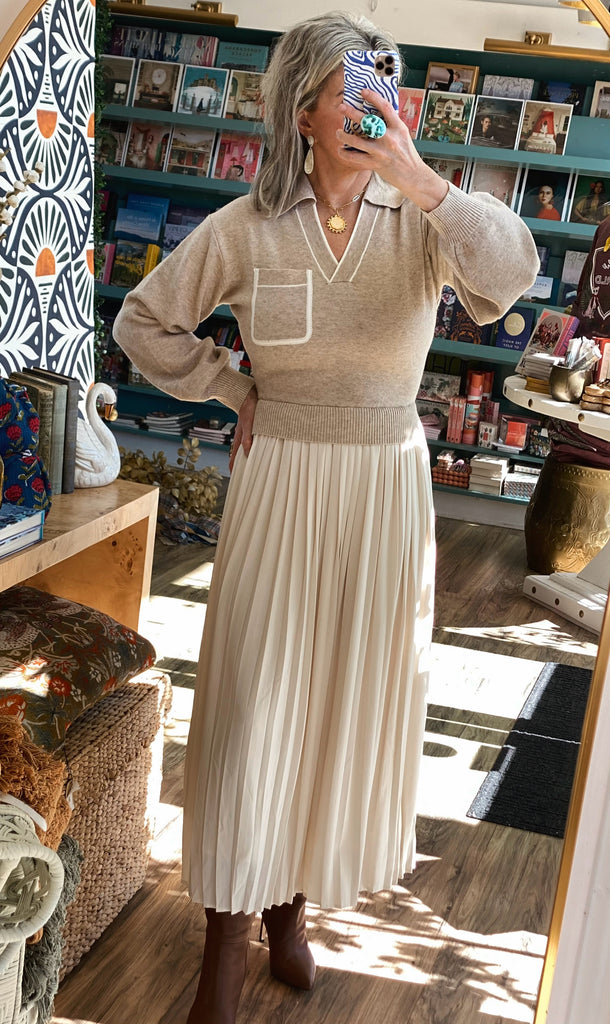 The elegance of a skirt set meets the ease of a single piece in this beautifully designed sweater dress. The soft knit top, crafted from a cozy blend of poly, acrylic, and nylon, features a collared neckline, contrast trim, and a flattering ribbed waist that flows seamlessly into a cream pleated skirt.