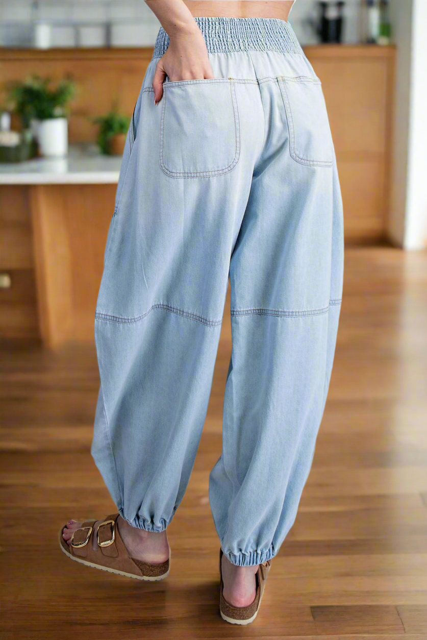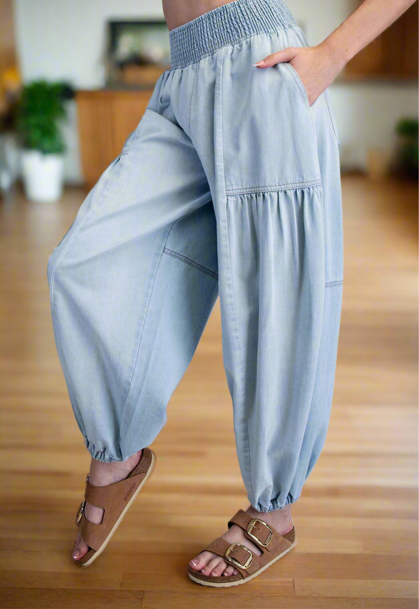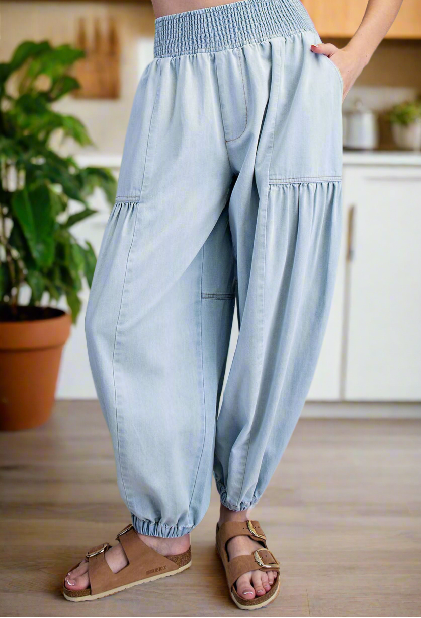 These light washed denim chambray pants feature a relaxed, voluminous silhouette with a high rise smocked waistband, uniquely accented by exposed seaming, gathered horizontal detailing across the legs, two side hip pockets, two back patch pockets, and elasticized cuffs for a comfortable, versatile fit. Cotton.
