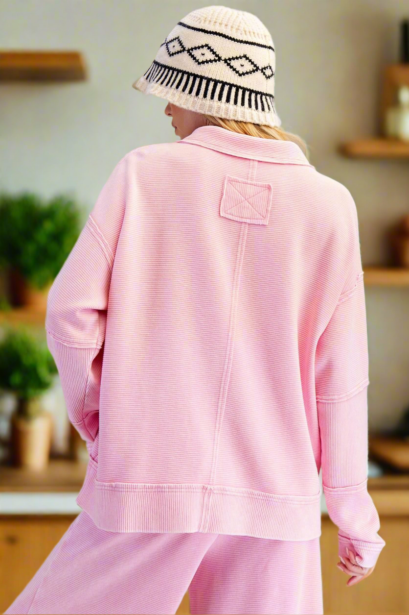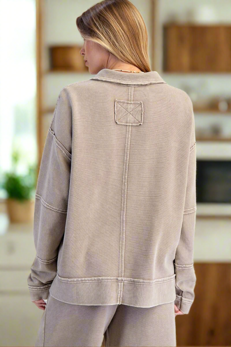 Crafted from textured thermal fabric with a distinctive mineral wash finish, this pullover delivers understated elegance with practical comfort. The collared neckline adds refinement, while the relaxed, oversized silhouette provides an effortless fit. Thoughtful side slits enhance movement and contemporary styling. Small measurements: 25 1/8" length, 24.25" bust.