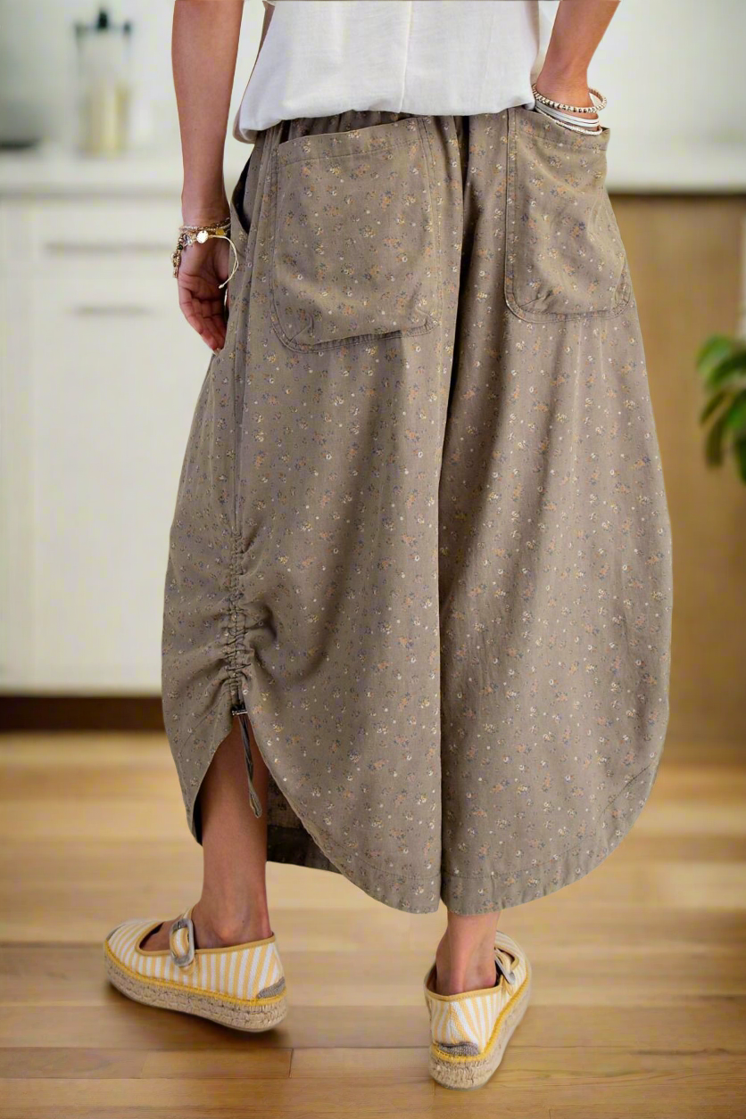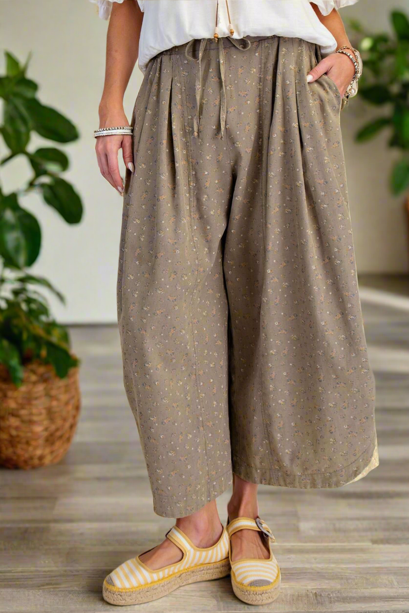 Embrace effortless elegance with these floral mineral wash twill pants. The relaxed, wide-leg crop silhouette offers a contemporary take on casual comfort, while the drawstring tie front allows for a customized fit. Practical side pockets and back patch pockets keep essentials within reach, and the elasticized smocked back waistband provides gentle support. 23.25" inseam.