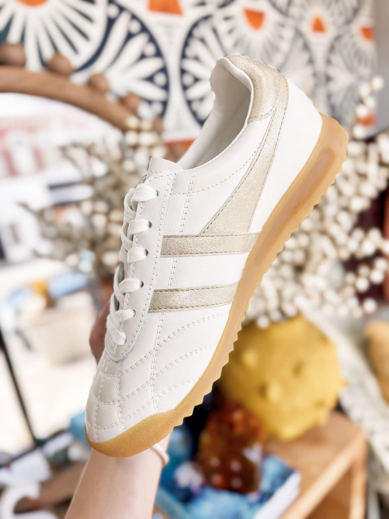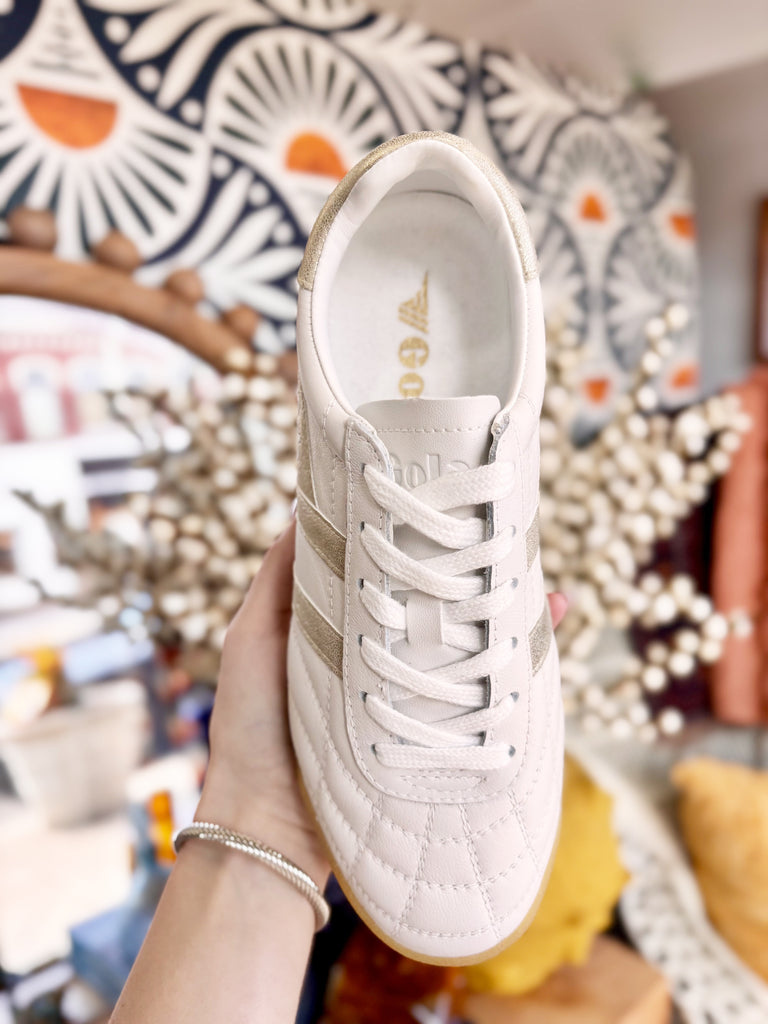 Straight off the pitch, Stadium is a fresh and stylish women’s sneaker inspired by the sports-core trend. Featured here in a modern white and gold palette, this women’s Gola sneaker really makes a statement and is loved by the fashion-set. Featuring a quilted upper, inspired by football boots, and a sleek heritage inspired gum sole.