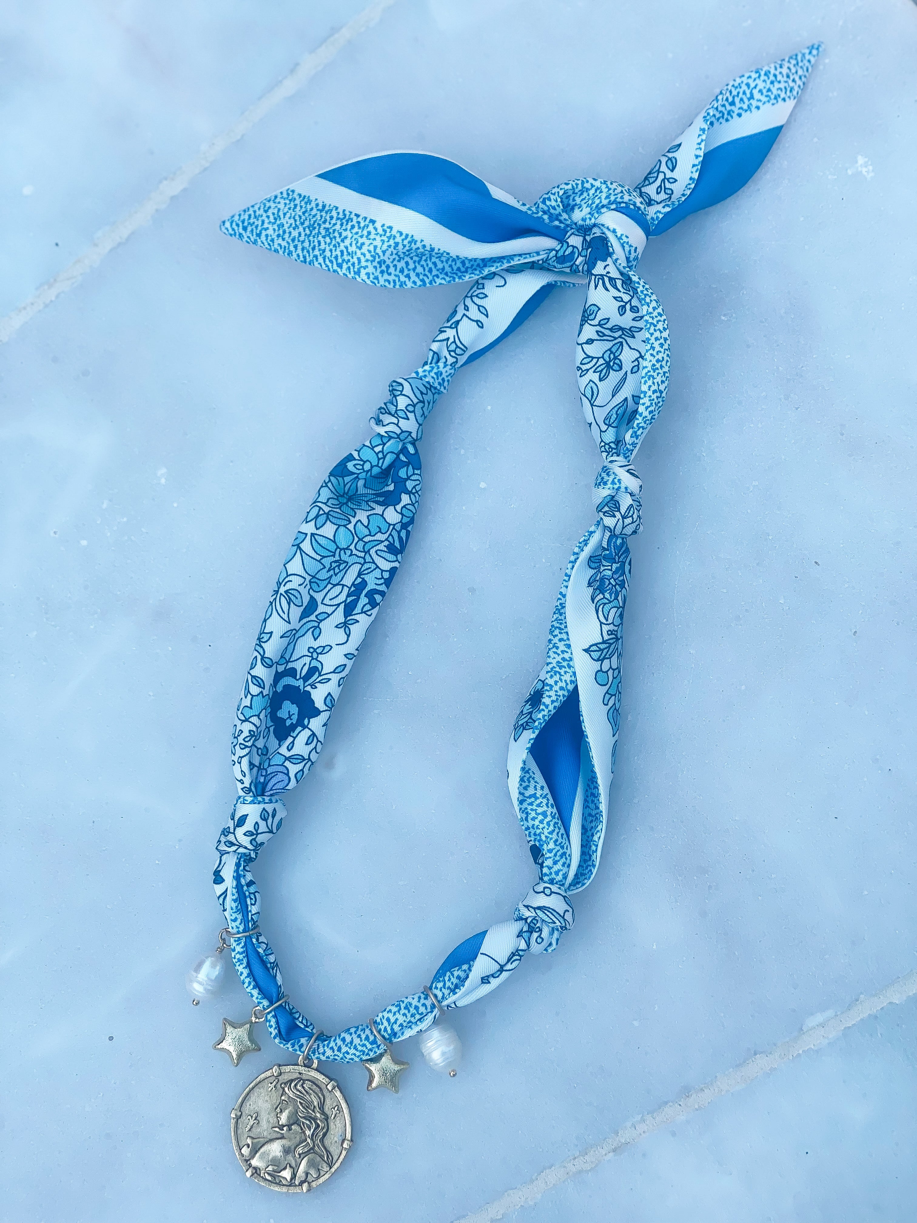 Bold, playful, and endlessly versatile—this scarf charm necklace adds instant personality to any outfit. The silky patterned scarf in vibrant shades of pink, red, and blue is accented with three eye-catching charms: a luminous mother-of-pearl heart framed in pearls, a sparkling crystal cross, and a chic gold lock. Lightweight yet statement-making, it can be worn as a necklace, tied around a ponytail, or wrapped around a handbag handle for a fashion-forward finishing touch.