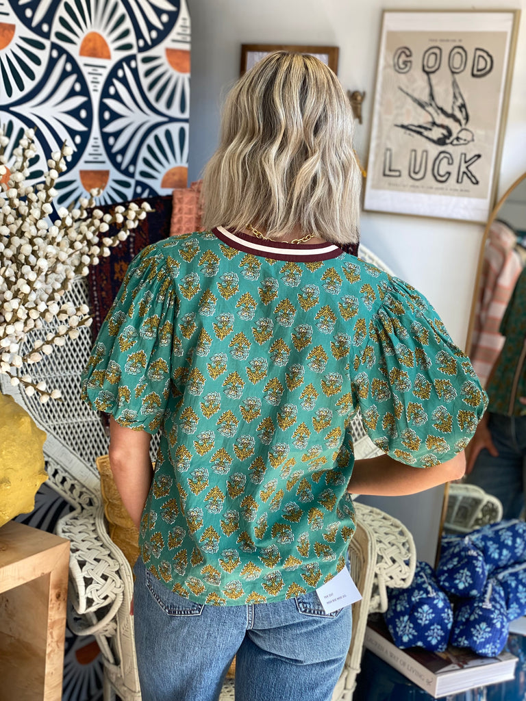 Effortlessly charming with a touch of vintage flair — this cotton pullover top from THML is the perfect mix of comfort and style. Featuring a hand-block-inspired floral print in shades of gold and olive on a soft teal base, it’s finished with contrasting maroon and ivory trim along the neckline and front for a polished touch. The puff sleeves add just the right amount of volume for a flattering, feminine silhouette.