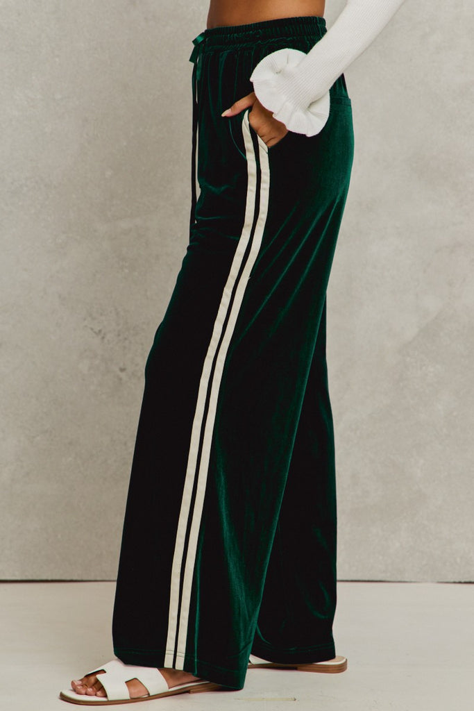 Soft, sleek, and so luxe, our Hunter Track Pants bring a touch of elevated comfort to your everyday rotation. Crafted from rich, deep-green velvet with a subtle sheen, these pants glide beautifully with every step. A relaxed, wide-leg silhouette pairs with an adjustable drawstring waist, giving you that perfect blend of polish and ease.