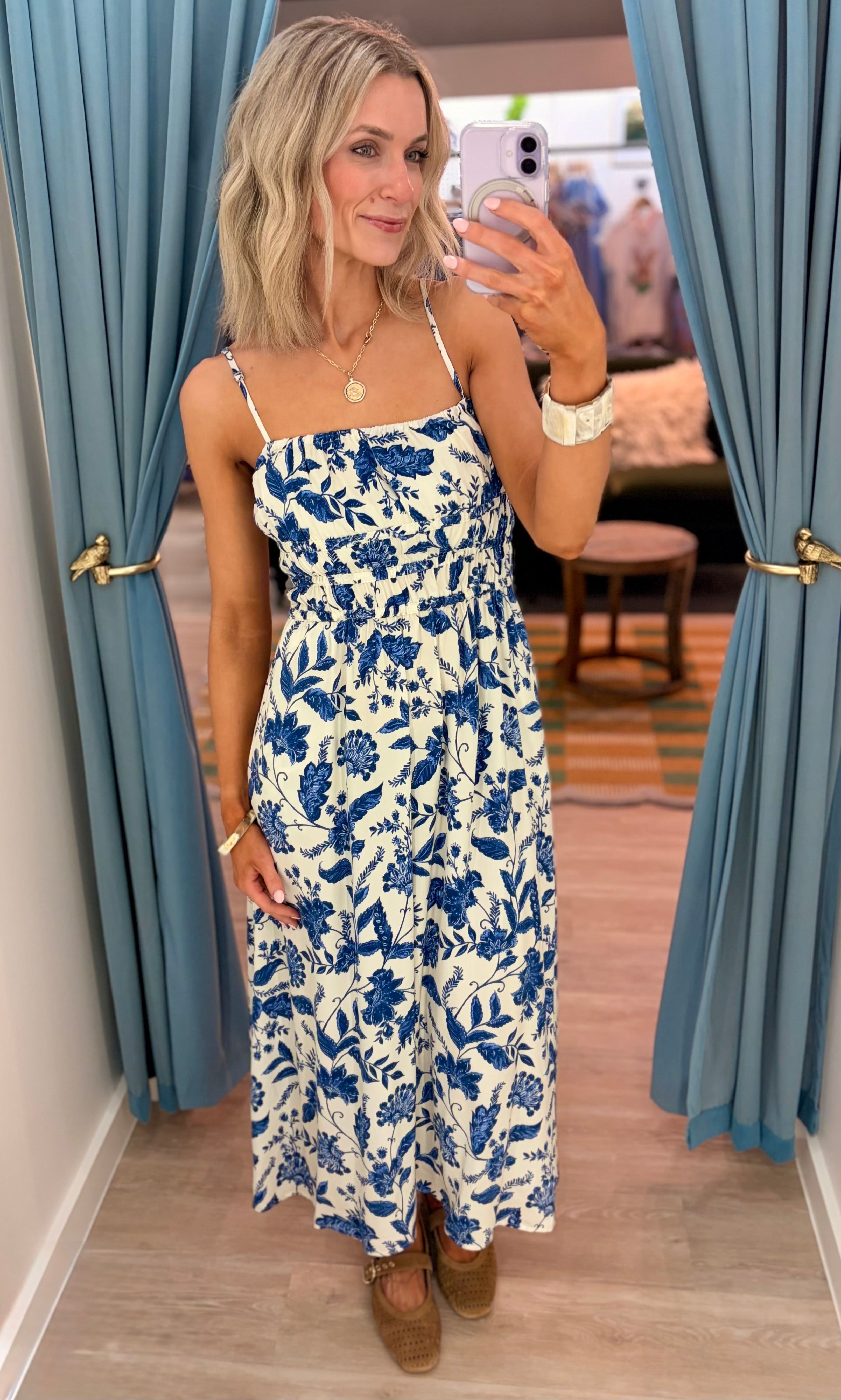 Fresh and feminine with an effortless feel. This floral midi dress features adjustable straps, a flattering smocked bodice, and a flowy skirt for all-day comfort. Lightweight and easy to wear—perfect for warm days and casual outings.