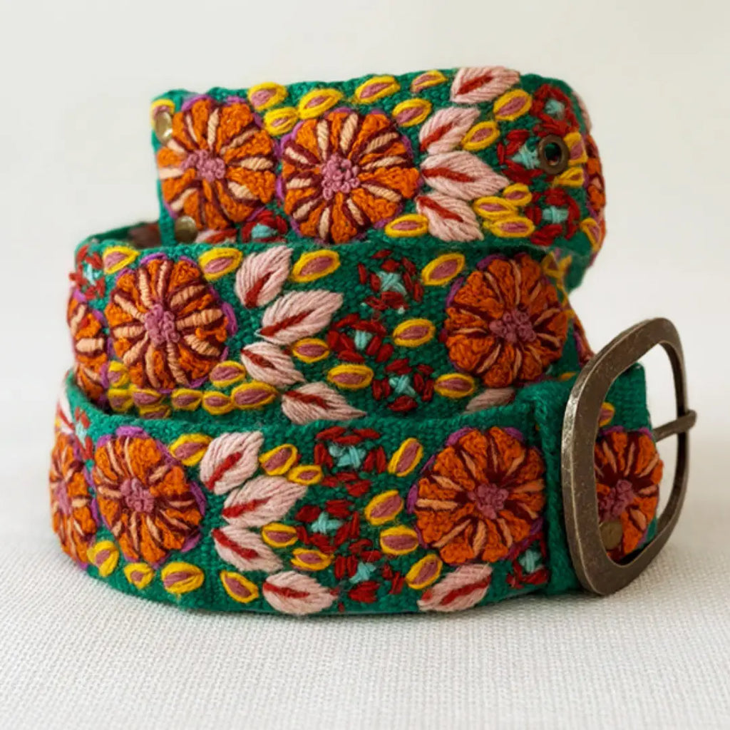 Gorgeous embroidered belts designed to be versatile with 5 sets of holes 2" apart - they can be worn at the hip or at the waist. If in-between sizes, we recommend sizing up.