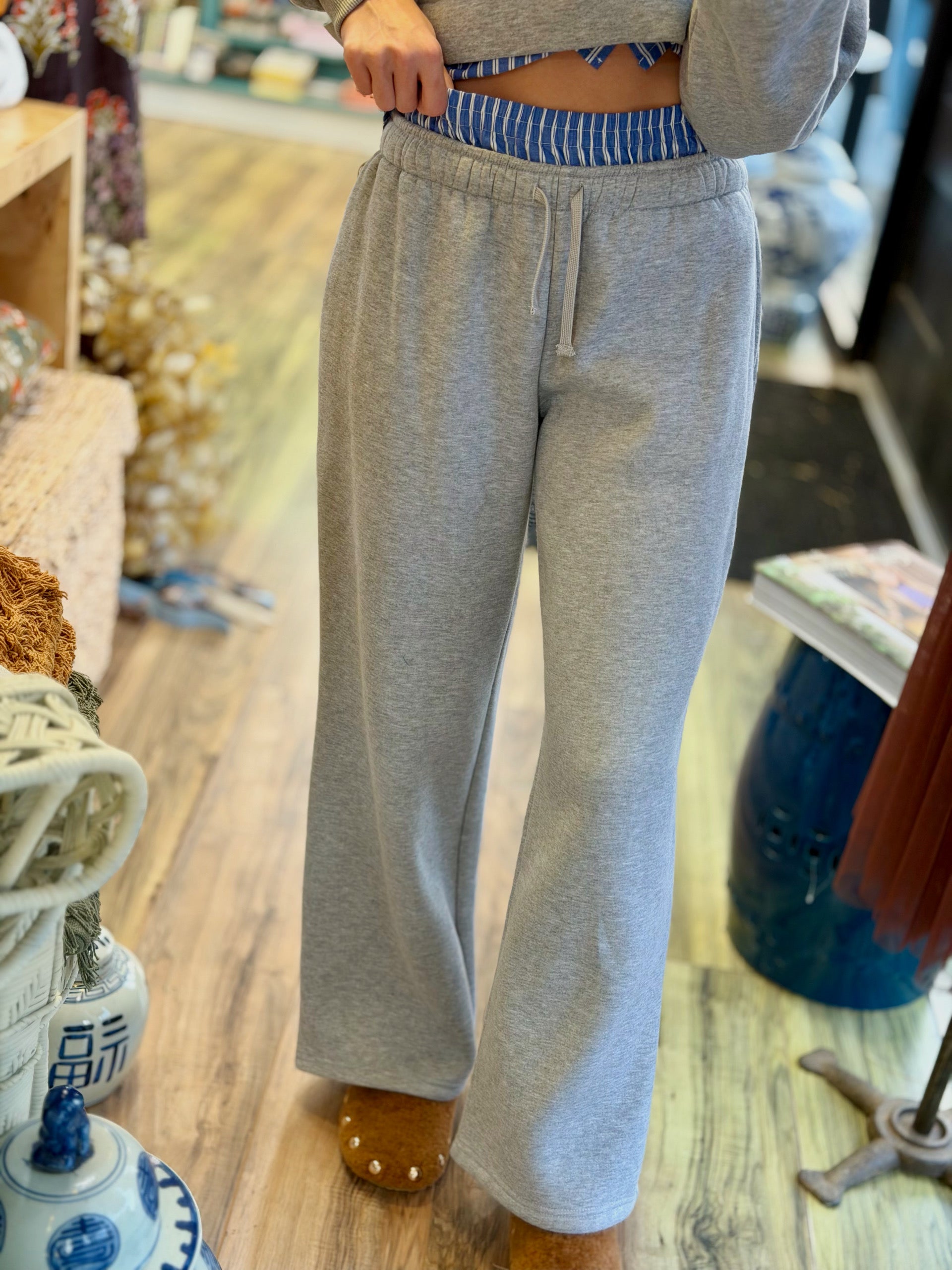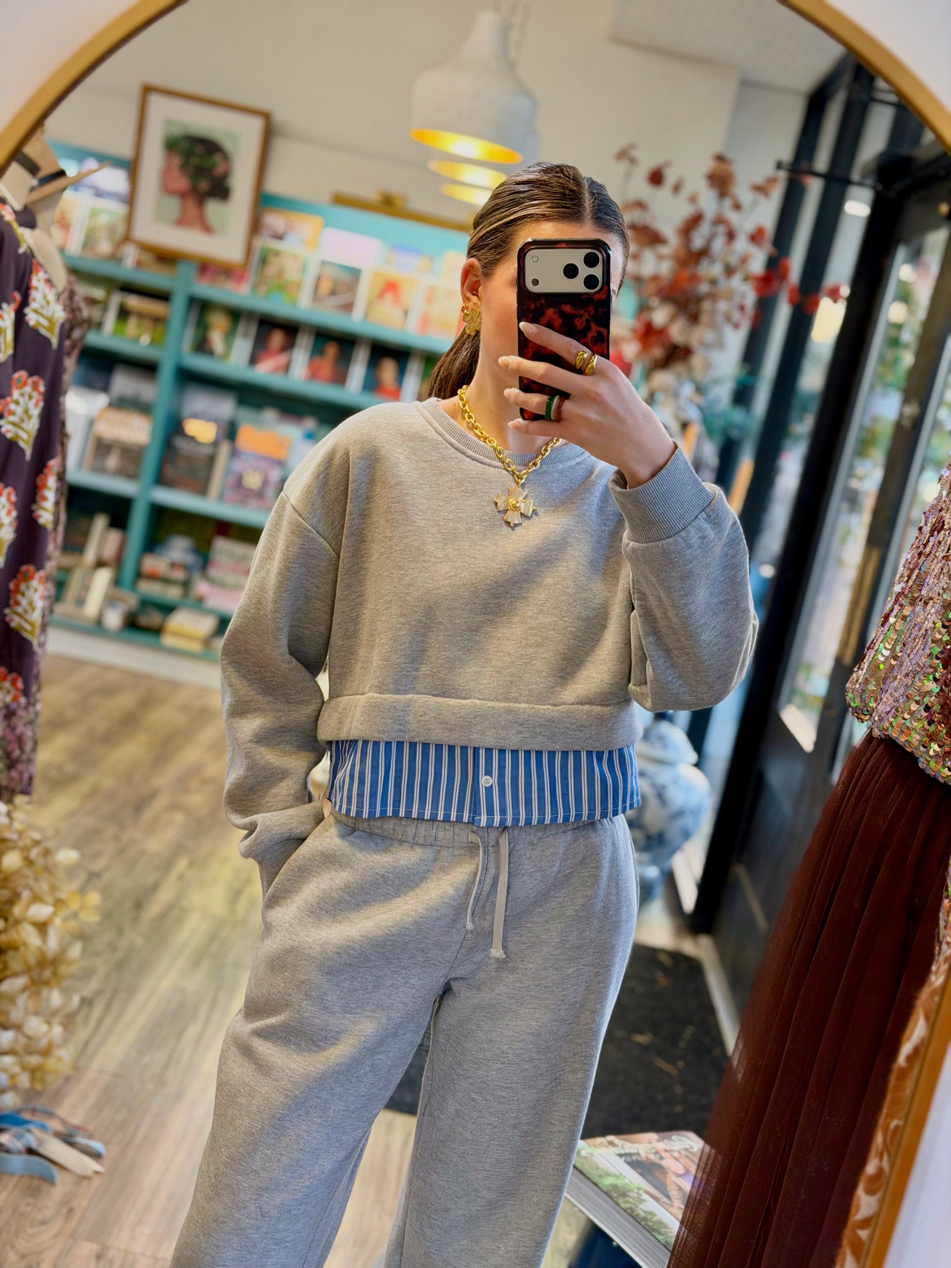 The Jersey Set from Vintage Havana features a relaxed, casual look with a soft grey sweatshirt and matching wide-leg drawstring pants. The sweatshirt includes a layered detail with a blue and white striped hem, adding a touch of contrast and structure to the laid-back silhouette. The sweatpants are designed with a boxer short waistband sewn above the drawstring, adding another layering detail that won’t ever miss!! Perfect for everyday wear, the set balances comfort and style with its cozy fabric and effortless fit.