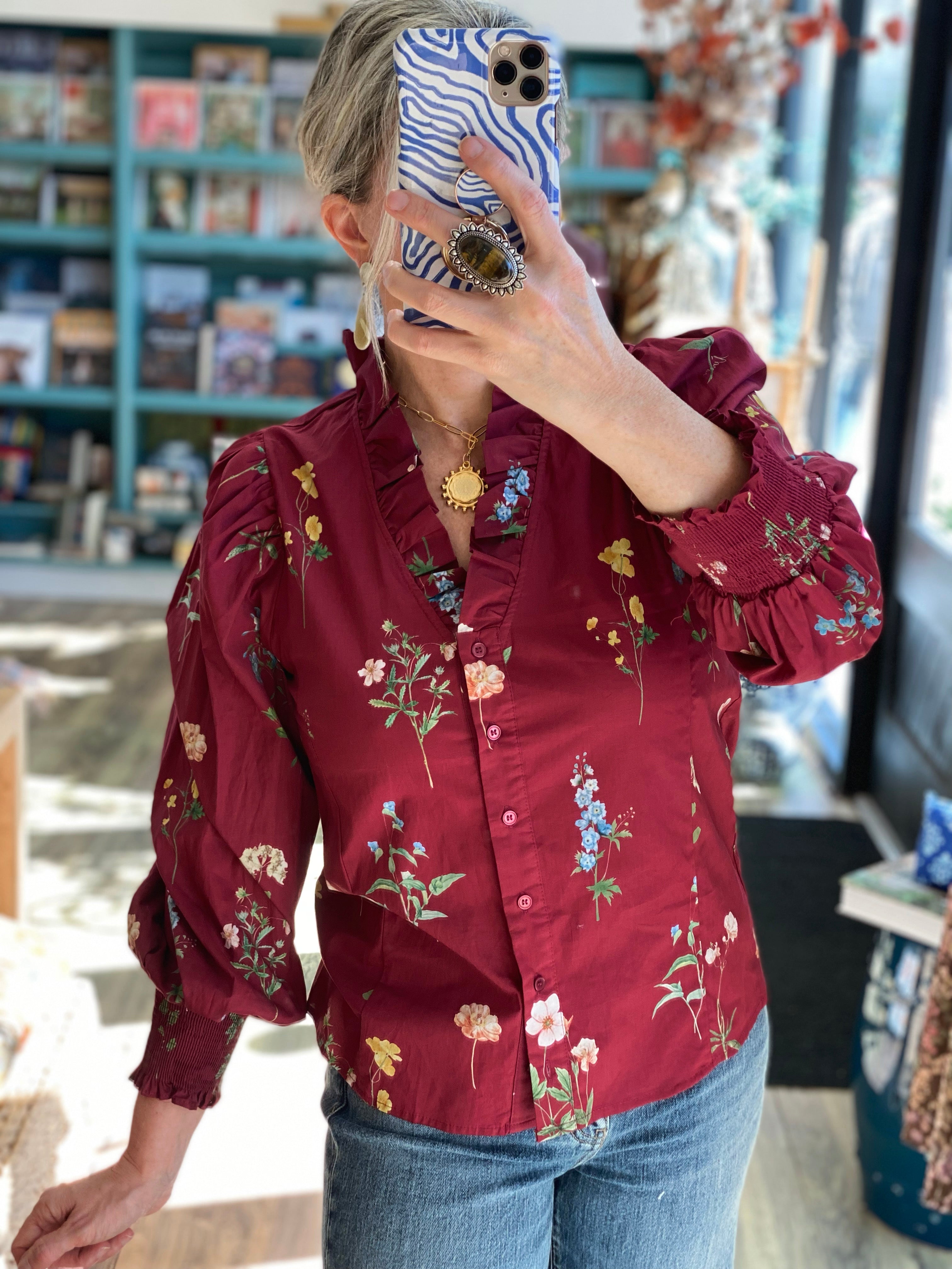 Romantic and timeless, this blouse features a rich burgundy floral print (also available in brown) on soft, breathable cotton. The design showcases delicate ruffle trim at the neckline, a button-front closure, and gently puffed long sleeves with buttoned cuffs for an elevated, feminine touch. The tailored fit skims the body beautifully, making it easy to style tucked into denim or paired with skirts for a dressier look.