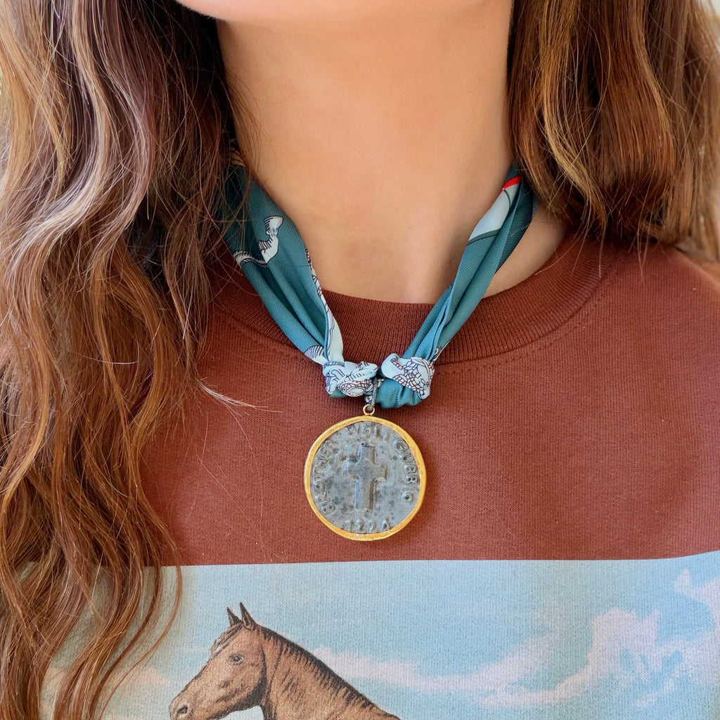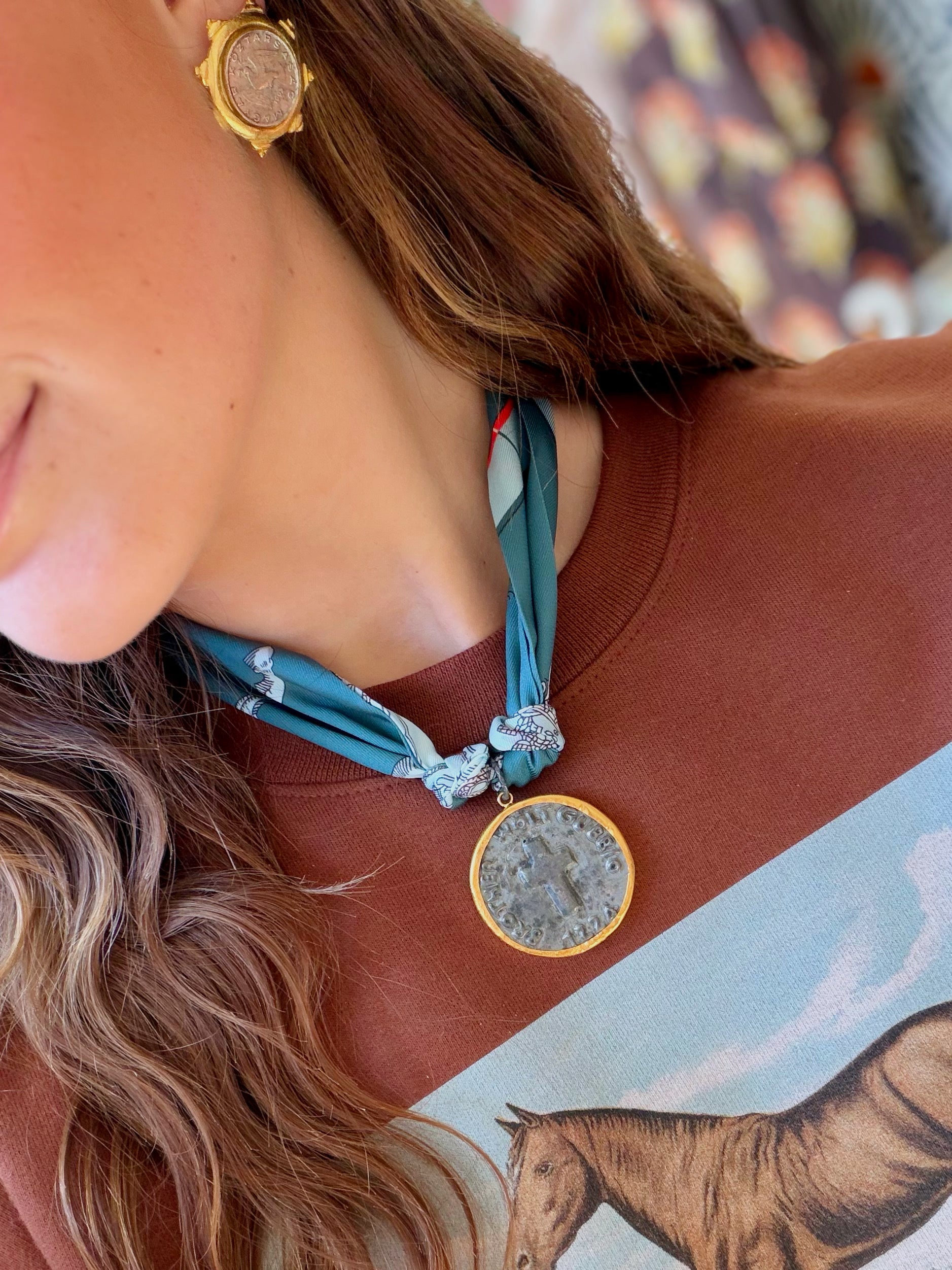 Elevate your everyday style with this effortlessly chic Miramar Scarf Necklace, where rustic charm meets refined elegance. A soft, teal patterned silk scarf is artfully knotted to cradle a vintage-inspired round pendant framed in warm gold tones. The pendant’s weathered texture and subtle cross motif evoke the character of an heirloom treasure, adding depth and meaning to any look.