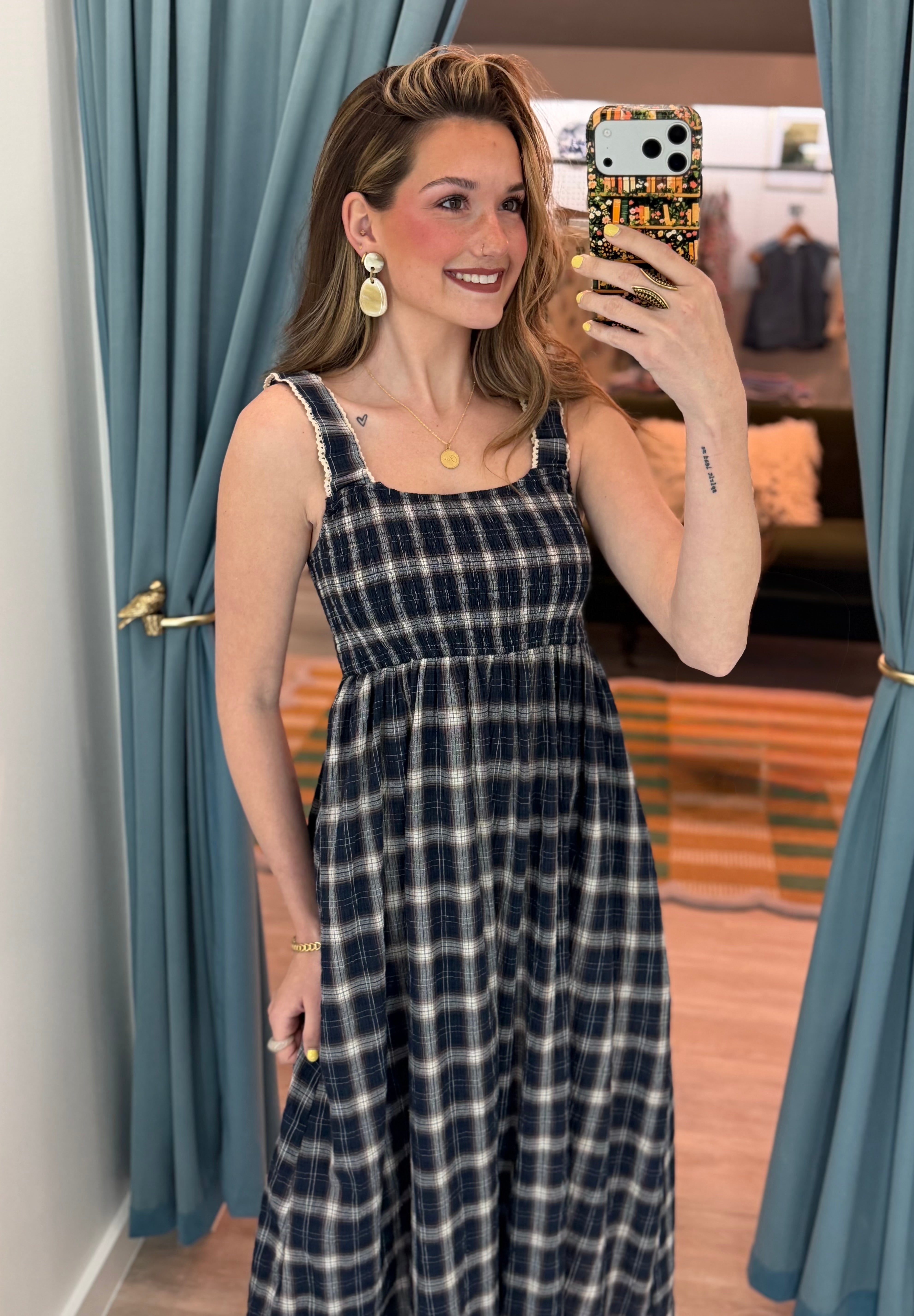 Easy, feminine, and timeless. This cotton midi dress features a classic plaid pattern paired with a flattering smocked bodice that offers a comfortable, flexible fit. The elasticized shoulder straps provide added ease while delicate trim details add a subtle, charming finish.