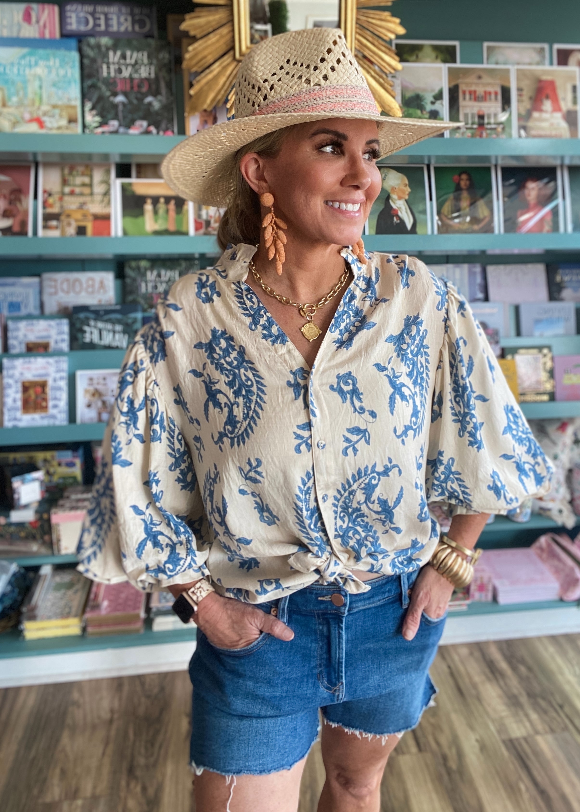 Gorgeous lightweight blouse in Cream featuring an allover block print. Three-quarter blouson sleeves.