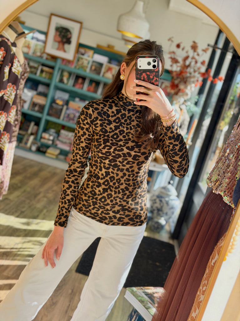 Channel effortless sophistication with a bold twist in Pepper Top. Crafted from a soft, stretchy knit, it contours beautifully to the body, offering both comfort and a flattering silhouette. The classic mock neck and long sleeves lend a touch of refinement, while the timeless animal print adds just the right amount of edge.