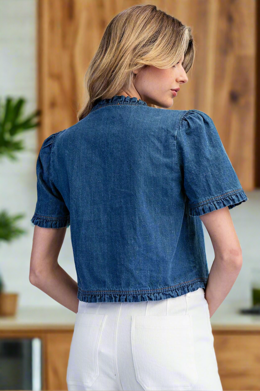 This denim top features a feminine, cropped silhouette with a ruffled V-neckline and functional button down front, accented by short puff sleeves with ruffled cuffs and a matching ruffled bottom hem for a comfortable, versatile fit.