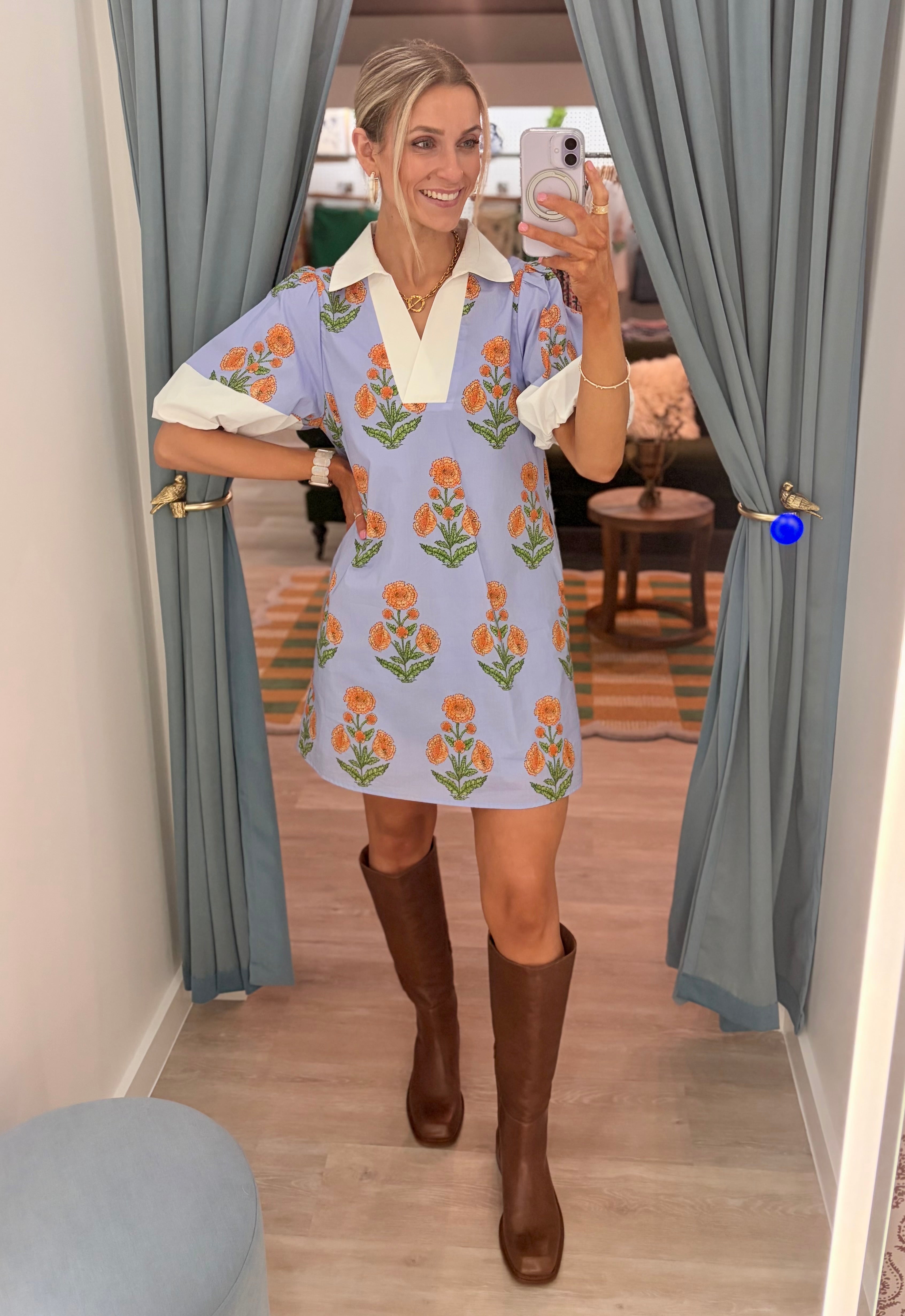 Fresh, playful, and effortlessly polished. This cotton dress from THML features a charming floral print in warm marigold tones set against a soft blue backdrop for a look that feels both classic and cheerful. Designed with a relaxed silhouette, it’s finished with a crisp contrast collar and placket that adds a tailored touch.