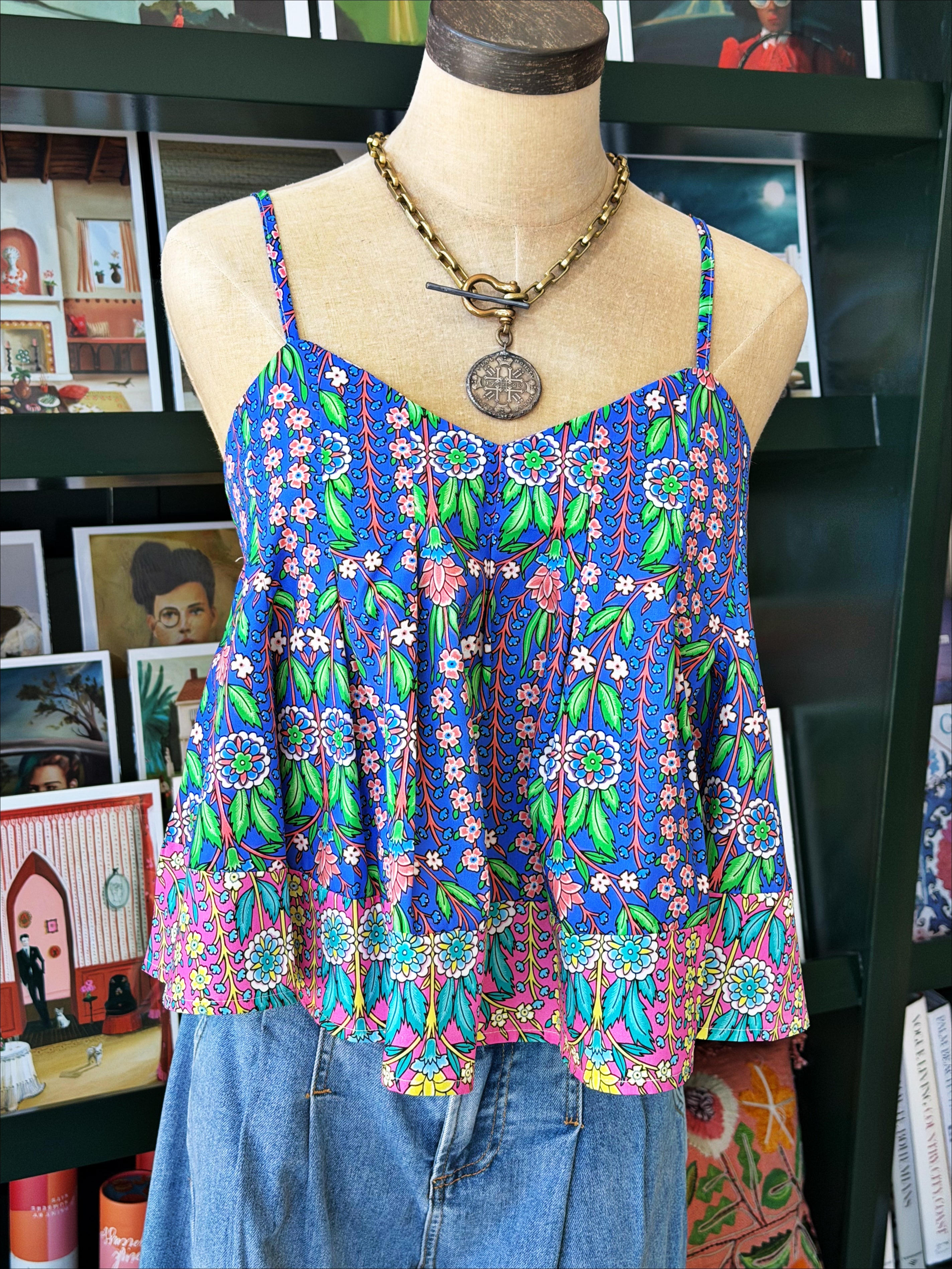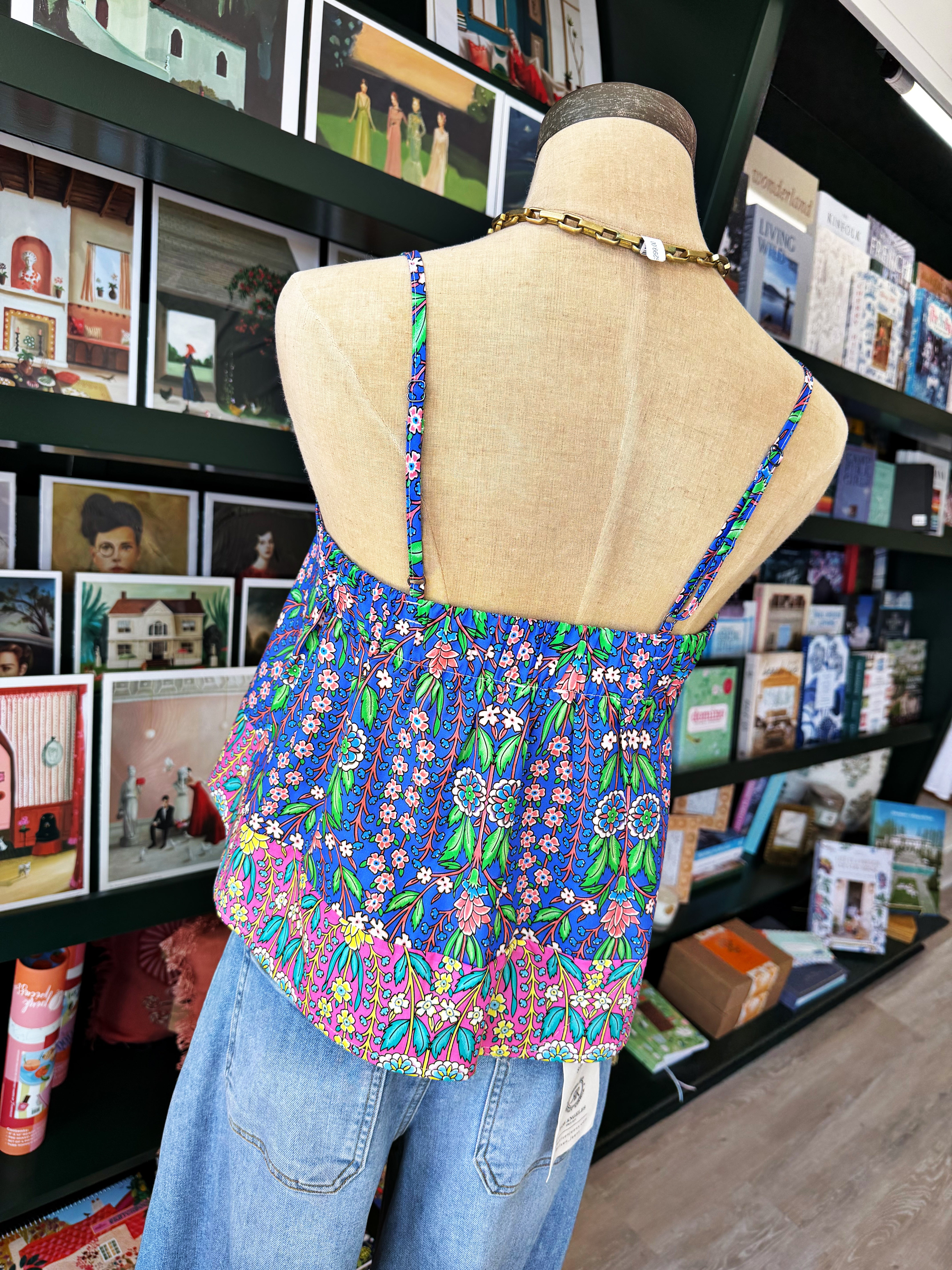 Bold, colorful, and effortlessly playful—this floral print tank from THML is made to stand out. Crafted from lightweight cotton, it features a vibrant mix of blues, greens, and pinks in an eye-catching floral pattern, finished with a contrasting border hem for added detail.