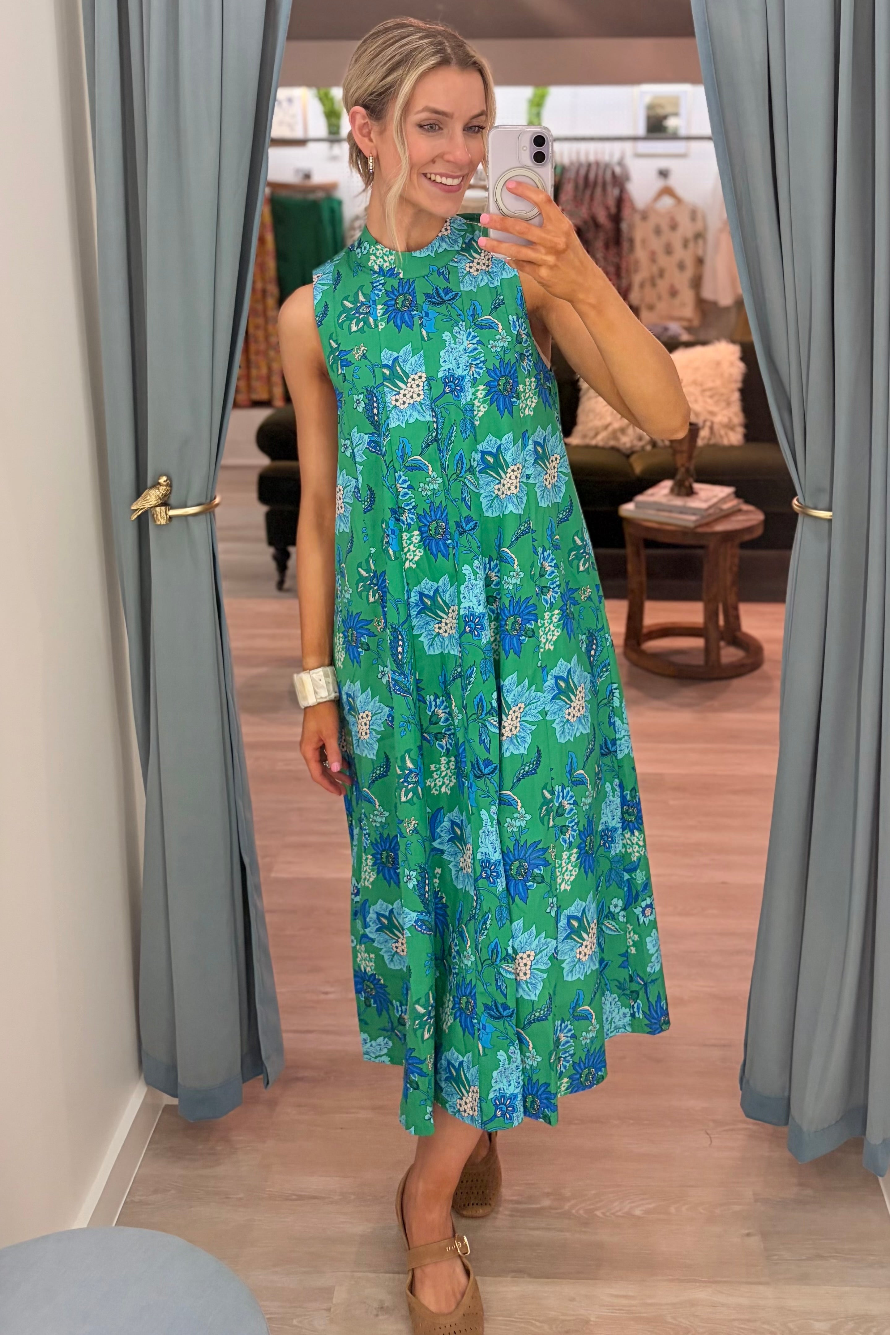 Fresh, feminine, and effortlessly elegant. This cotton midi dress from THML features a vibrant green floral print with shades of blue and soft ivory for a timeless, eye-catching look. The sleeveless silhouette and flowing skirt create beautiful movement, while the delicate tie-back neckline adds a charming finishing detail.