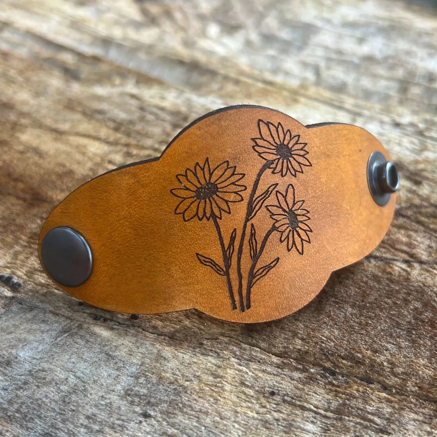 Simple and chic leather bandana slide. Classic style snaps on or slides over light weight scarves and bandanas.